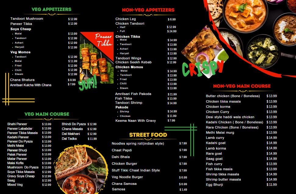 The menu features a variety of Indian dishes, organized into several categories to suit different tastes and dining occasions. Available throughout the day, the Veg Appetizers section includes items such as Paneer Tikka, Soya Chaap, Veg Momos, Chana Bhatura, and Amritsari Kulcha with Chana, offering a selection of small plates suitable for starters or light meals.