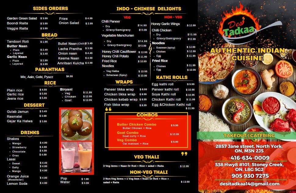 Sides Orders provide accompaniments that include Garden Green Salad, Boondi Raita, Veggie Raita, Fries, and Onion Salad, which can complement main dishes or be enjoyed separately. The Paranthas category features traditional Indian flatbreads available at a consistent price.